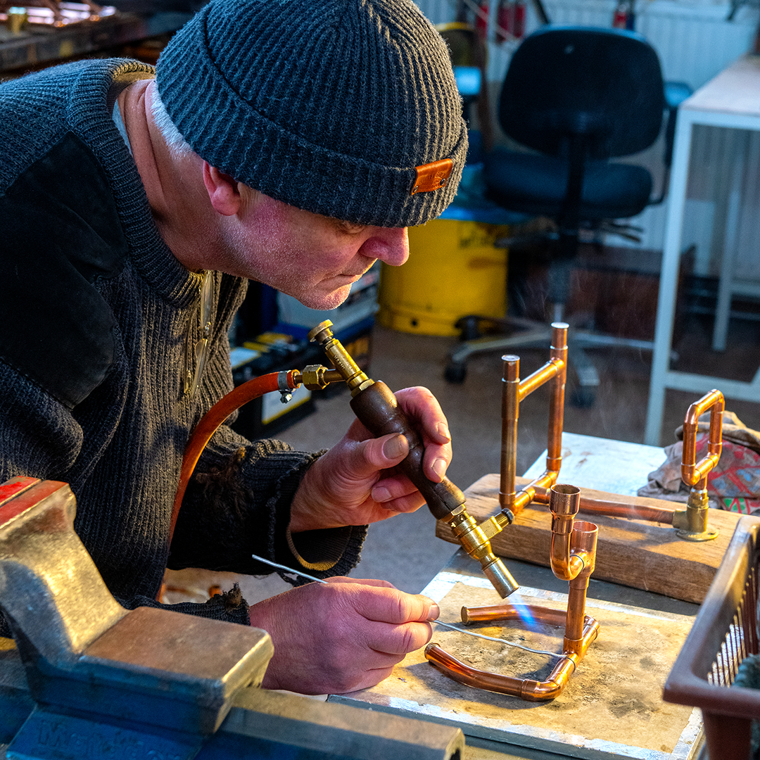 De belangstelling voor Dicks workshops en trainingen is groot, zo bleek op het Ambacht In Beeld-festival in Amsterdam. ,,Dat was in 2019. Bezoekers hadden gelezen dat ik van koperleidingen kandelaars maak. Daar kwamen veel mensen op af. Zij wilden dat ook leren.’’ De aanpak van Dick is de volgende. Een voorbeeld. ,,Eerst liet ik ze zien hoe je de leiding buigt en opschuurt. Zo maak je de pijp gereed om te solderen. Daarop voerden ze die handeling zelf uit.’’